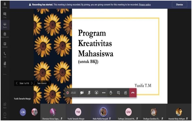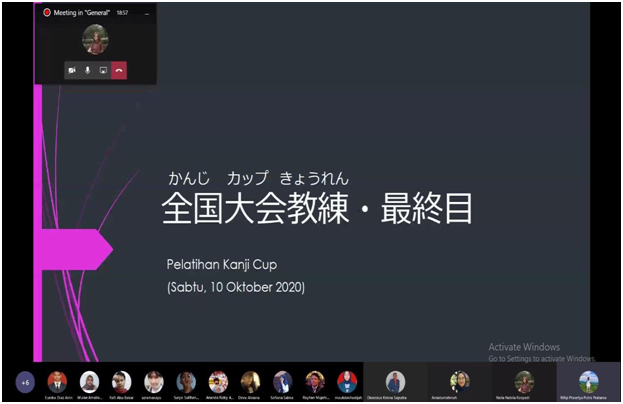 Japanese language and culture. The target of this activity is active students of S – 1 Japanese language and culture as senior advisors and new studentsJapanese language and culture class of 2020 as a member. The time of implementation of this activity is the first guidance class Saturday, September 12, 2020 and the second guidance class Wednesday, September 13, 2020. This activity is carried out online by using Ms. Teams. Here is the documentation of its activities :