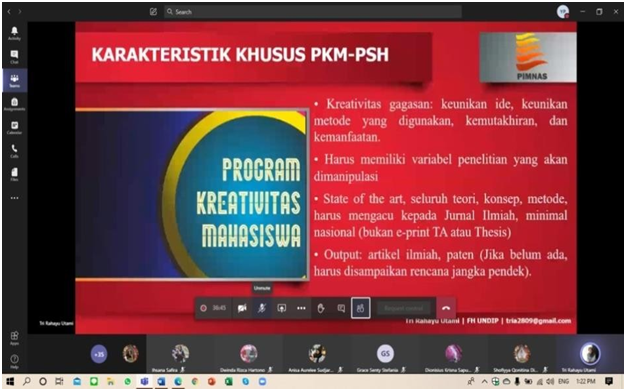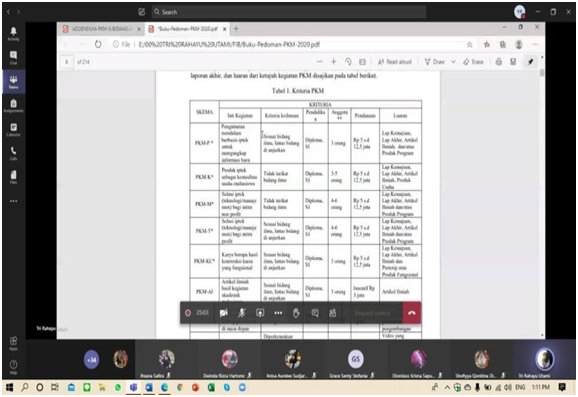 The mentoring process for the student creativity Program (PKM) is assistance for new students in 2020 in preparing proposals for student creativity Program (PKM) activities. Senior Advisor PKM together with new students prepare proposals PKMuntil uploaded to web DIKTI. The purpose of this activity is to fulfill the obligations of the department in order to support Diponegoro University to become a research university in 2020, introduce campus research to new students in 2020, and reinforce the foundation of climate research in the S-1 Study Program