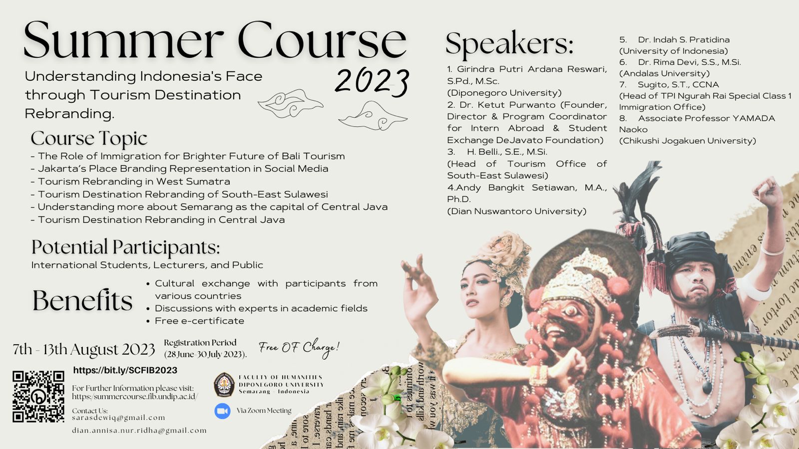 The Summer Course activity “Understanding Indonesia’s Face Through Tourism Destination Rebranding” will be held in August 2023 by the Diponegoro University Faculty of Cultural Sciences Summer Course team. This activity will raise a number of topics that focus on the potential and process of rebranding various tourist destinations in Indonesia (including culinary, the surrounding creative industry, the latest regulations regarding turus, and so on). The tourism sector has become one of the important sectors for regional and country economic growth. Indonesia has a variety of attractive tourist destinations and has made Indonesia a popular tourist destination not only among domestic tourists, but also among foreign tourists. However, the problems that later arise related to tourism are as follows. Certain tourist destinations have become very popular among domestic and foreign tourists so that the local residents of the area are disturbed. On the other hand, certain tourist destinations are less popular than other tourist destinations. This is what will be tried to be raised in the Summer Course activities this time, namely the potential and process of rebranding various kinds of tourist destinations in Indonesia